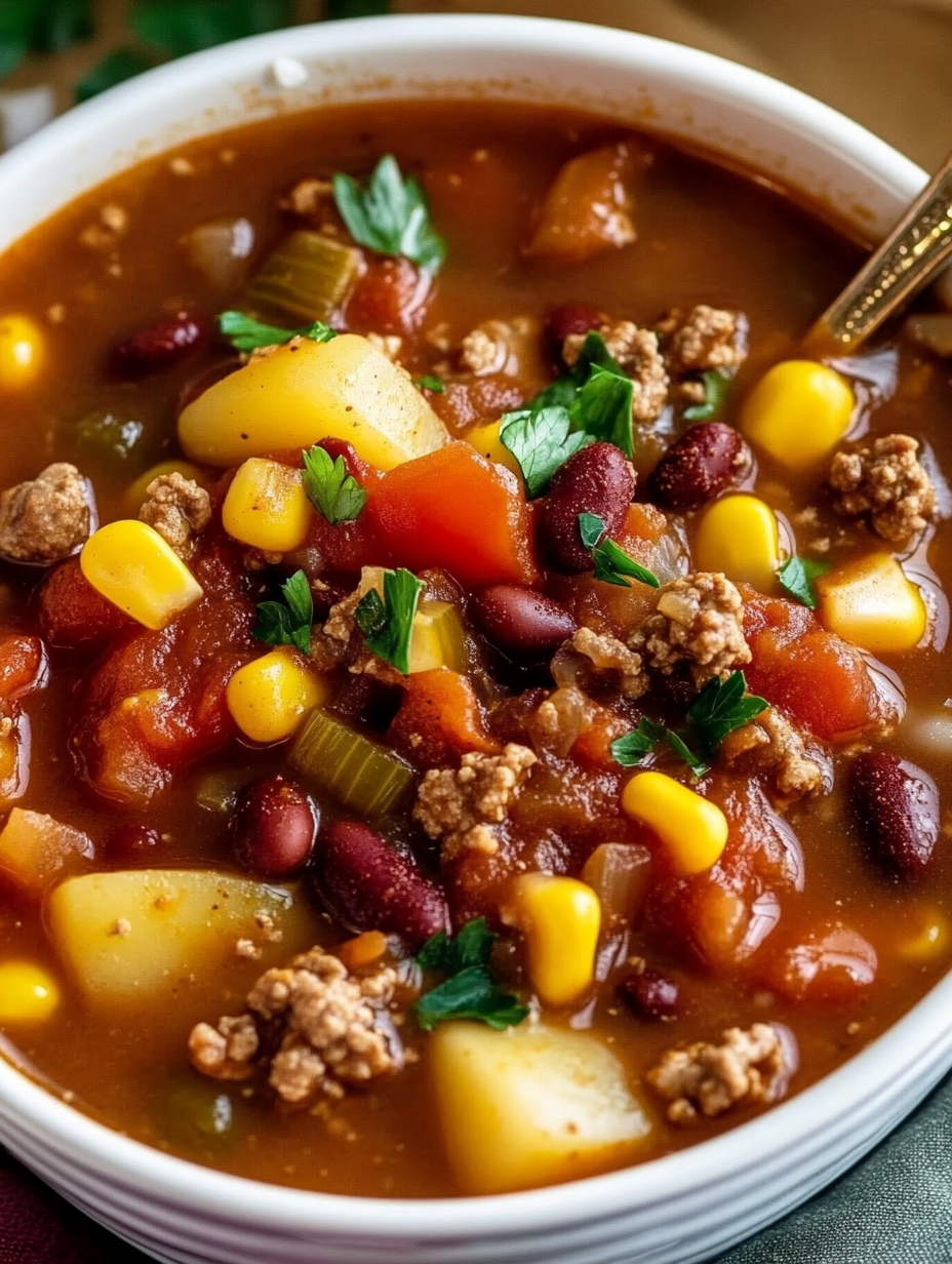 Imagine a cross between chili and vegetable beef soup. That’s the vibe. But unlike traditional chili, this soup includes potatoes and a lighter broth base, making it slightly less thick but just as comforting.