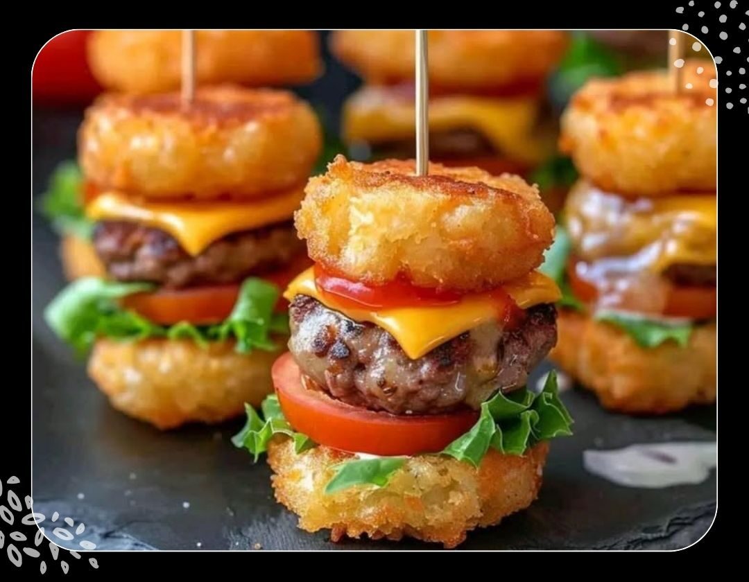 Mini Tater Tot Cheeseburgers are exactly what they sound like — tiny burgers made by sandwiching a flavorful mini beef patty between two crispy tater tots. Instead of buns, you get golden, crunchy potato bites. They’re stacked with lettuce, cheese, pickles, and a cherry tomato slice, then held together with a toothpick for the cutest presentation ever.