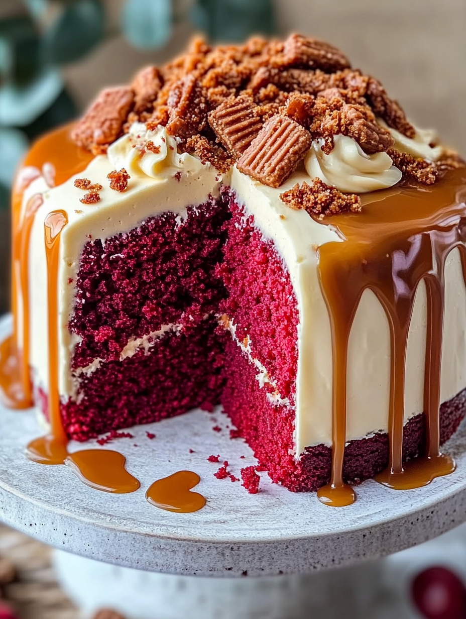 If you’re someone who believes dessert should be more than just sweet—something memorable, almost magical—then this Red Velvet Biscoff Caramel Cake is about to become your new obsession. Imagine a soft, velvety cake with that classic hint of cocoa, layered with creamy richness, topped with crunchy Biscoff cookies, and finished with a silky caramel drizzle. It’s like a symphony where every ingredient plays its part perfectly.