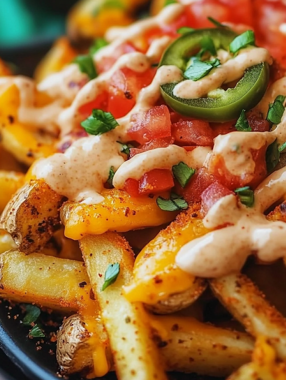 Once the fries are done, sprinkle them with the remaining Taco Bell seasoning. Place the fries on a serving plate, pour the warm nacho cheese sauce over the top, and then add sour cream, jalapeños, tomatoes, green onions, and shredded cheese.